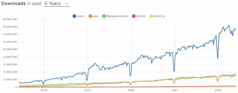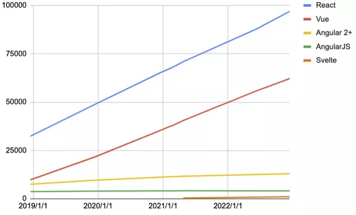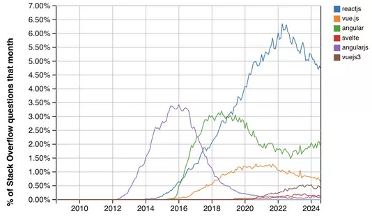 تعداد سوالات داخل stackoverflow برای react svelte angular vue
